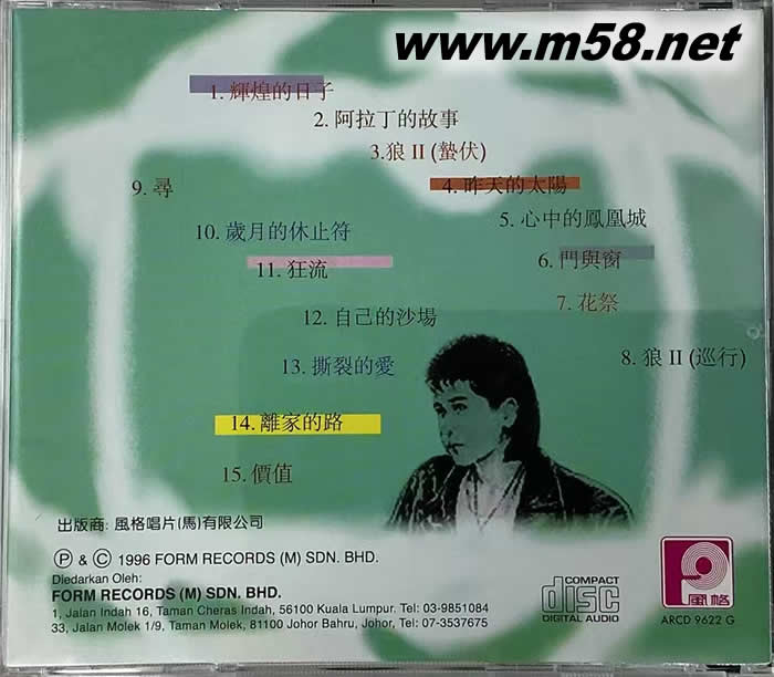 01. 輝煌的日子 02. 阿拉丁的故事 03. 狼II(蟄伏) 04. 昨天的太陽 05. 心中的鳳凰城 06. 門與窗 07. 花祭 08. 狼II(巡行) 09. 尋 10. 歲月的休止符 11. 狂流 12. 自已的沙場 13. 撕裂的愛 14. 離家的路 15. 價值