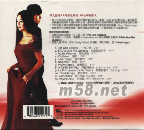 微醺 探戈(小提琴與鋼琴)(m58.net) 在探戈之都--布宜諾斯艾利斯(BUENOS AIRES) 活躍的閃耀新星 探戈大師--破亞左拉(ASTOR PIAZZOLLA)遺孀LAURA ESCALADA給予高度評價(jià)的樂團(tuán) 韓式抒情混合阿根廷熱情 調(diào)味出微醺探戈 張力十足的探戈樂曲,遇見內(nèi)斂含蓄的東方二重奏--Duo Orientango,當(dāng)年歐洲移民遷徙到南美新大陸的鄉(xiāng)愁之情,重新被這兩位客居阿根廷的韓籍音樂家召喚出聲。 不同于當(dāng)今其他窮盡演奏技法與賣力表現(xiàn)探戈舞蹈節(jié)奏的樂團(tuán),Duo Orientango選擇東方式的情感詮釋,雖然含蓄卻深情依舊、不愿鋪張仍不失華麗本質(zhì)。 電影中的探戈推薦曲^^^ 艾爾帕西諾的電影[女人香]有[POR UNA CABEZA] 探戈歌王一卡洛斯·加戴爾(CARLOS GARDEL)的自傳電影主題曲[EL DIA QUE ME QUIERAS] 英國女導(dǎo) 莎莉·波特(SALLY POTER)的電影[蘿幻舞神]有[LIBERTANGO]