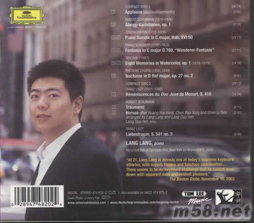 COMPACT DISC 1 APPLAUSE(APPLAUDISSEMENTS) ROBERT SCHUMANN(1810-1856) ABEGG-VARIATIONEN,OP。1 JOSEPH HAYDN(1732-1809) PIANO SONATA IN C MAJOR,HOB,SVI:50 FRANZ SCHUBERT(1797-1828) FANTASIA IN CMAJOR D 760,WANDRER-FANTASIE TAN DUN(1957) NOTURNE IN D FLAT MAJOR,OP 27,NO。2 REMINISCENCES DU DON JUAN DE MOZART,S。418 TRAUMEREI LIEBESTRAUM,S。541NO。3 LANG LANG,PIANO