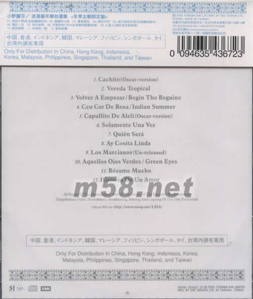 浪漫嘉年華自選集(臺(tái)版)(m58.net) 2005年小野麗莎連續(xù)推出以拉丁為主題的浪漫嘉年華3張系列作品,陪伴我們渡過了充滿熱帶風(fēng)情的一季。迎接新的年度的來臨,小野麗莎特別從浪漫嘉年華vol.1、vol.2、vol.3 這3張作品中精選出各自最具代表的人氣歌曲,經(jīng)過重新編曲后呈現(xiàn)出全新風(fēng)貌的[Cachito 我的小男孩]、[Capullito De Aleli 桂竹香的花苞]及年度熱門話題左岸咖啡館廣告曲[Ay Cosita Linda 可愛的你]…等及限定盤追加從未發(fā)表曲目[Los Marcianos 火星人派對(duì)]共12首作品