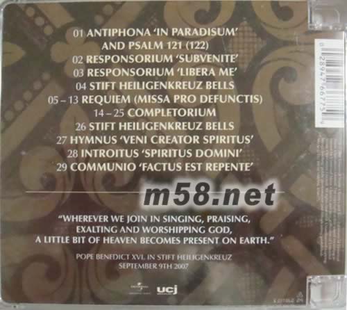 1.Antiphon "In Paradisum"And Psalm121(122) 2.Responsorium "Subvenite" 3.Responsorium "Libera Me" 4.Stift Heiligenkreuz Bells 5-13.Requiem( Missa Pro Defunctis) 14-25.Completrium 26.Stift Heiligenkreuz Bells 27.Hymnus "Veni Creator Spiritus" 28.Introi"Spiritus Domini" 29.Communio"Factus Est Repente"