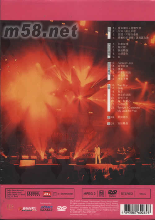 合唱 01. 愛如潮水/習(xí)慣失戀 02. 兄妹/歲月如歌 03. 認(rèn)錯/只想你會意 04. 想著你的感覺/讓我跟你走 張信哲獨唱 05. 到處留情 06. 眼紅館 07. 我的驕傲 08. 太想愛你 09. 追 容祖兒獨唱 10. Forever Love 11. 自言自語 12. 勇氣 13. 不要對他說 14. 明日恩典 15. 呼天不應(yīng) 合唱 16. Bad Boy 17. 自由 18. 寓言 19. 無言的結(jié)局 20. 美中不足 21. 有一點動心 22. 心仍是冷 23. Tonight I Celebrate My Love For You 24. 愛如潮水(張信哲) 25. 我的驕傲(容祖兒)