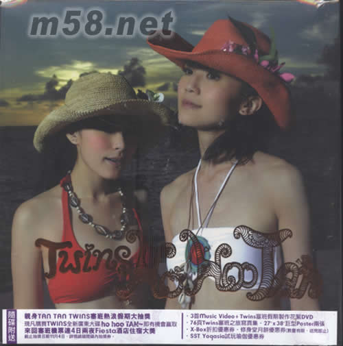 隨碟附送 親身YAN YAN TWINS塞班熱浪假期大抽獎 現凡購買TWINS全新廣東大碟HO HOO TAN-即有機會贏取來回塞班機票邊4日兩夜FIESTA酒店住宿大獎 截止抽獎日期 11月4日 ,詳情請細閱碟內抽獎券. 3首MUSIC VIDEO+TWINS塞班假期制作花絮DVD 76頁TWINS塞班之旅寫真集·27"X38"巨型POSTER兩張 X-BOX折扣優惠券·修身堂月餅優惠券(數量有限,送完即止) SST YOGASIA試玩瑜伽優惠券