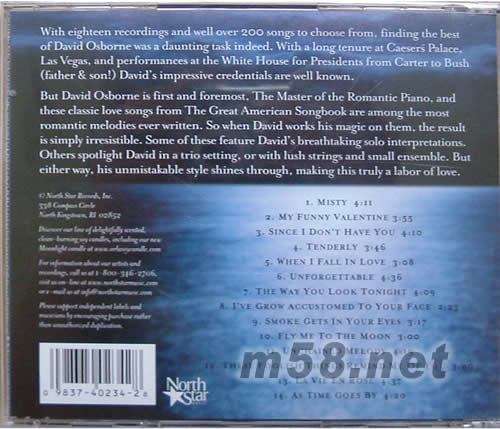月伴情歌 MOONLIGHT & LOVE SONG(m58.net) 這張由北極星公司推出的唱片,選曲方面相當花心思,全都是一些30-50年代很好聽的經典情歌,加上DAVID OSBORNE精心演繹,清脆的琴聲,讓這張唱片繼白鋼琴黑鋼琴后另一張令人愛不釋手的鋼琴集