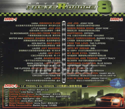 CD2 1. Joe Joe - Jenny Rom - 喬依喬依 速度超速尬車相伴最佳舞曲 2. Robin Robin Hood –Jenny Rom - 羅賓漢之歌 急速動感電音軋車必備曲 3. Happiness – Zippers - 幸福 紅遍日本游樂機主題曲一起來尬車吧 4. Billy Coroccodile – Barbie Young - 比利鱷魚 超速俏皮尬車舞曲一定要聽 5. Free The Love – The Flippers - 讓愛自由 超熱量動感飚車必備曲 6. Into My Dream – Bibi - 進入我夢中 趴拉趴拉舞曲動感百分百不可錯過 7. My Blue Eyes – Tommie B. - 我的藍眼珠 舞廳每晚必播電音佳作飚車必備 8. Magical And Tender – Nancy Tracy - 魔幻與柔情 俏皮可愛軋車舞曲包你破表 9. Roppongi Carillon – Blue Roses - 滴答滴答鐘樂聲 好聽又夠快絕對不會落伍 10. Black Tiger – F.C.F. - 黑虎 歐陸好聽佳作收藏尬車必備電音金曲 11. Deep Into Your Eyes – Danny Wilde - 在你眼神深處 舞迷無法抗拒保證HIGH翻天動力源源不斷 12. Ichi Ni San San – Urban Tokyo - 一二三三 穿插日文快節奏電音潮流新指針 CD 3 12” Friendly DJ Version 12吋黑膠DJ接歌專用版 1. Orinoco Flow – Hanna - 奧利諾科之流 2. Joo Joo – Little Barby - 小喬喬 3. Calling From Tokyo – DJ Moonraker - 東京呼喚 4. Congo (Rambo Revenge) – Mister Max - 藍波剛果復仇記 5. Bad Love – Ken martin - 錯愛 6. Joe Joe - Jenny Rom - 喬依喬依 7. Robin Robin Hood –Jenny Rom - 羅賓漢之歌 8. Billy Coroccodile – Barbie Young - 比利鱷魚