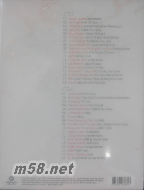 LOVE ACOUSTIC(m58.net) 華納唱片繼 2012年推出《Acoustic》成功熱賣后,今年情人節再接再厲,推出情人節情歌專輯 《Love Acoustic》,收錄電臺新寵: Gabrielle Aplin - The Power Of Love及 Norah Jones – December、Emi Fujita –First Of May、Olivia Ong - Sometimes When We Touch、Lisa Ono – I Wish You Love、Glen Hansard & Marketa Irglova - Falling Slowly、Jason Mraz - I'm Yours 共 36首清新愛情小品。
