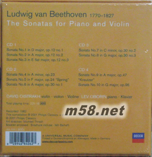 Total Playing Time: [47:53] CD 4 Sonata for Violin and Piano No.9 in A, Op.47 - "Kreutzer" [1] 1. Adagio sostenuto - Presto [11:40] [2] 2. Andante con variazioni [15:23] [3] 3. Finale (Presto) [6:59] Sonata for Violin and Piano No.10 in G, Op.96 [4] 1. Allegro moderato [10:35] [5] 2. Adagio espressivo - 3. Scherzo (Allegro) [8:30] [6] 4. Poco allegretto [8:25]