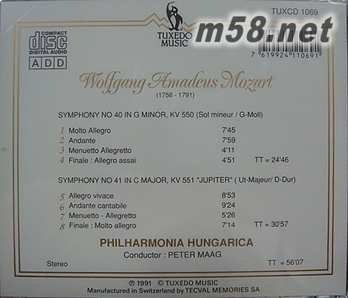 價(jià)格為估,以實(shí)到貨為準(zhǔn)! Mozart: Symphonies 40 & 41 莫扎特:交響曲40 & 41(m58.net) 莫扎特:第40號(hào)<朱彼特>交響曲彼得馬格指揮指揮 匈牙利愛(ài)樂(lè) 彼得馬格(petr maag):著名瑞士指揮家,會(huì)師富特萬(wàn)格勒(furtwangler),及擔(dān)任安塞美(ansermet)副手:他素以莫扎特錄音享負(fù)盛名 立體聲錄音,瑞士原裝進(jìn)口。