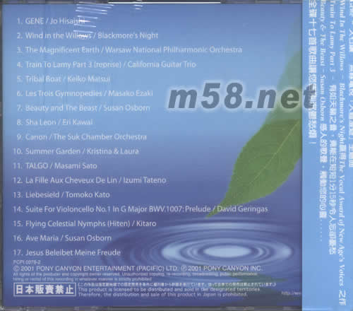1.GENE/Jo Hisaishi 2.Wind in the Willows/Blackmore's Night 3.The Magnificent Earth/Warsaw National Philharmonic Orchestra 4.Train To Lamy Part3(reprise)/California Guitar Trio 5.Tribal Boat/Keiko Matsui 6.Les Trois Gymnopedies/Masako Ezaki 7.Beauty and The beast/Susan Osborn 8.Sha Leon /Eri Kawai 9.Canon/The Suk Chamber Orchestra 10.Summer Garden/Kristina & Laura 11.TALGO/Masami sato 12.La Fille Aux Cheveux De Lin/lzumi Tateno 13.Liebesield/Tomoko Kato 14.Suite For Violoncello NO.1 in G Major BWV.1007:PRELUDE/David Geringas 15.Flying Celestial Nymphs(Hiten)/Kitaro 16.Ave Maria/Susan Osborn 17.Jesus Beleibet Meine Freude