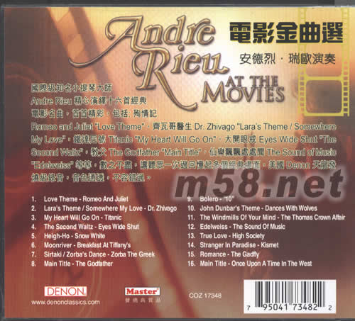 AT THE MOVIES電影金曲選(m58.net) 請點看產(chǎn)品正、背面大圖 國際知名小提琴大師ANDRE RIEU安德烈 瑞歐! 精心演繹十六首電影名曲 柔情的演奏琴音細致動人 美國天龍發(fā)燒級通透錄音 ANDRE RIEU精心演繹十六首經(jīng)典電影名曲,首首精彩,包括:殉情記ROMEO AND JULIET “LOVE THEME齊瓦哥醫(yī)生DR ZHIVAGO “LARA‘S THEME/SOMEWHERE MY LOVE”鐵達尼號TITANIEC“MY HEART WILL GO ON ”,大開眼界“EYES WIDE WHUT”THE SECOND WHLTZ“,教父THE GODFATHER”MAIN TITLE“,仙樂飄飄處處聞THE XOUND OF MUSIC ”EDELWEISS“等等,數(shù)之不盡,讓聽眾一次過回憶起多個經(jīng)典場面,美國DENON天龍發(fā)燒錄音,音色通透,不容錯過。