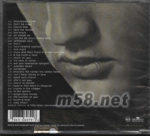 1. Heartbreak Hotel 2. Don't Be Cruel 3. Hound Dog 4. Love Me Tender 5. Too Much 6. All Shook Up 7. (Let Me Be Your) Teddy Bear 8. Jailhouse Rock 9. Don't 10. Hard Headed Woman 11. One Night 12. (Now And Then There's) A Fool Such As I 13. A Big Hunk O' Love 14. Stuck On You 15. It's Now Or Never 16. Are You Lonesome Tonight? 17. Wooden Heart 18. Surrender 19. (Marie's The Name) His Latest Flame 20. Can't Help Falling In Love 21. Good Luck Charm 22. She's Not You 23. Return To Sender 24. (You're The) Devil In Disguise 25. Crying In The Chapel 26. In The Ghetto 27. Suspicious Minds 28. The Wonder Of You 29. Burning Love 30. Way Down A Little Less Conversation (JXL Radio Edit Remix)