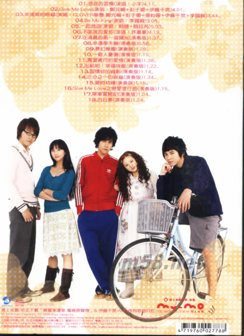 蜂蜜幸運草 電視原聲帶(青春寫真版)(m58.net) 改編自日本人氣漫畫,繼日本動畫及電影版後,由《人魚朵朵》臺灣導演李蕓嬋執導,眾青春偶像—《惡作劇2吻》鄭元暢、《基因決定我愛你》彭于晏、《白色巨塔》張鈞甯、《深海》蘇慧倫,以及李國毅、張翰、陳宇凡、歌手蘇見信與日本樂團AAA成員伊藤千晃主演這部甜蜜與夢幻的愛情劇《蜂蜜幸運草》。劇集把五位在美術大學的好友們在深摯友情下發展的兩段三角關系,如何面對愛情、友情及未來的故事,2008年搬上華視小銀幕。 適逢這套純真和清新偶像劇即將上畫,劇中主角之一鄭元暢、彭于晏、張鈞甯、伊藤千晃和李國毅還特別藉此機會組成史上最強的夢幻樂團「CLOVER幸運草樂團」,且演唱了片頭曲「幸運草的祝福」。這是一首青春洋溢和輕快的同樂歌,CLOVER幸運草樂團成功演繹了最動聽的主題曲。碟內還有眾演員合唱、由彭于晏Rap的「Give Me Love」,以及2008年度新人小宇的抒情歌「堅持著愛你」。 青春寫真版加贈∶ 明信片八張 偶像貼紙 寫真留言冊