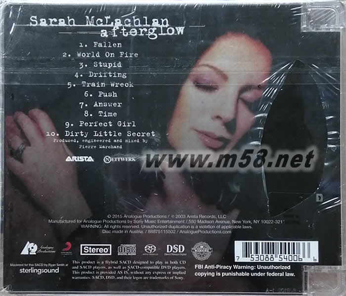 AFTERGLOW晚霞 SACD(m58.net) 擁有西洋歌壇“知性女聲掌門人”之稱,以電影《City Of Angel》主題曲Angel成為轟動全球國民情歌的加拿大女歌手這位行過去Sarah McLachlan的地位更因為一手創辦空前的女性搖滾音樂演唱盛事--“莉莉絲音樂節”,讓眾多歌手崇拜不已,其中近來唱片狂賣的蒂朵就是Sarah McLachlan頭號歌迷,而擅長翻唱的Westlife也曾將Angel再度唱紅,甚至披頭四大老Paul McCartney幾年前現場聆聽Sarah McLachlan演唱Angel更因遙念愛妻而當場
