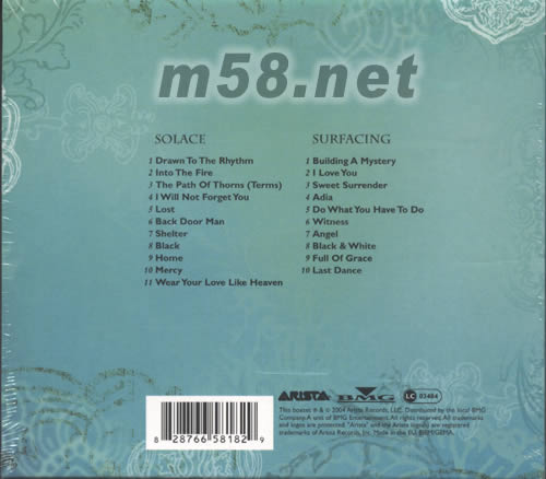 價格為估,以實到貨為準! SOLACE & SURFACING(m58.net) 詳情參數請點看產品正、背面大圖 三座葛萊美獎、五座朱諾獎得主,專輯創下百萬銷量的加拿大創作才女Sarah mclachlan第二張個人專輯。收錄其早期最經典曲目《Drawn to the rhytnm》、《Into the fire》等,復古的Alternative rock風情、對原始旋律最純情的詮釋,讓你欣賞到這位歌壇宿將最青春、最率真的音樂形象。本輯的推出樹立了她在加拿大本土樂壇的天后地位。