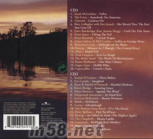 CD 1 1 SARAH MCLACHIAN-FALLEN 2 THE CORRS-SOMEBODY FOR SOMEONE 3 CLANNAD-CAISLEAN OIR 4 RORY CALLAGHER WITH BERT JANSCH-SHE MOVED THRO'THE FAIR/ ANN CRAN UII 5 DAVE BAINBRIDGE(feat.Joanne Hogg)-UNTIL THE TIDE TURNS 6 FIONA JOYCE-LIFTING THE VEIL 7 BRIAN KENNEDY-CARRICK FERGUS 8 JAMES GALWAY &PHIL COULTER-CAILIN NA GRUAIGE BAINE 9 WATERSON;CARTHY-MIDNIGHT ON THE WATER 10 RUNRIG-ABHAWN AN T-SLUALGH(THE CROWED RIVER) 11 ALTAN-ISIAND GIRL 12 DICK GAUGHAN-ERIN GO BRAGH 13 THE BOTHY BAND-THE MAIDS OF MITCHELSTOWN 14 KAREN MATHESON-ONE MORE CHANCE 15 ANGUS LYON-10,000 MILES 16 CAPERCAILLIE-COISICH A RUIN CD2 1 SINEAD O'CONNOR-THRE BABIES 2 EVA CASSIDY-SONGBIRD 3 RYAN & RACHEL O'DONNELL-MARTHA'S HARBOUR 4 EDEN'S BRIDGE-AMAZING GRACE 5 MAIRE BRENNAN-AGAINST THE WIND 6 FAIRGROUND ATTRACTION-AY FOND KISS 7 LOREENA MCKENNITT-BONNY PORTMORE 8 SKILDA-AIRFAILARIN 9 CORUN-GLENDALOUGH 10 THE HUDSON SWAN BAND-O'ER THE OCCAN 11 DAVY SPILLANE-PORT NA BPUCAI 12 RUNRIG-AN UBHAL AS AIRDE(THE HIGHEST APPLE) 13 THE CAMPBELLS-RHANA LADDIE 14 CANTERACH-MCPHEE'S REEL(MEDLEY) 15 IONA-DIVINE PRESENCE 16 FIONA KENNEDY-RIVERDANCE