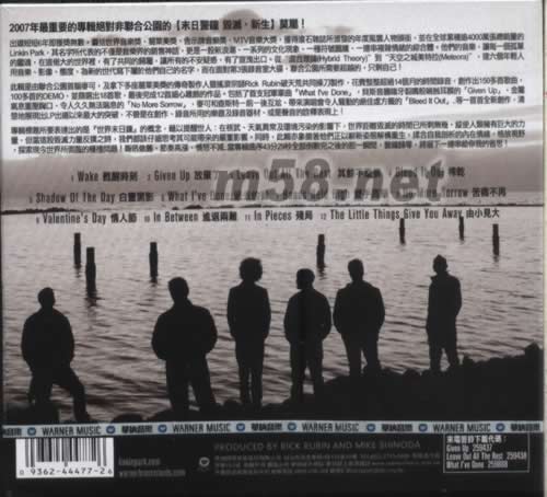 1、WAKE 2、GIEVEN UP 3、LEAVE OUT ALL THE REST 4、BLEED IT OUT 5、SHADOW OF THE DAY 6、WHAT I ‘VE DONE 7、HANDS HELD HIGH 8、NO MORE SORROW 9、VALENTINE’S DAY 10、IN BETWEEEN 11、IN PIECES 12、THE LITTLE THINGS GIVE YOUR AWAY