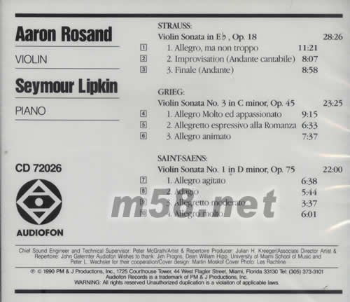 VTRAUSS: VIOLIN SONATA IN E B,OP.18 1.ALLEGRO .MA NON TROPPO 2.IMPROVISATION (ANDANTE CANTABILE) 3.FINALE(ANDANTE) GRIEG: VIOLIN SONATA NO.3 IN C MINOR,OP.45 4.ALLEGRO MOLTO ED APPASSIONATO 5.ALLEGRETTO ESPRESSIVO ALLA ROMANZA 6.ALLEGRO ANIMATO SAINT-SAENS: VIOLIN SONATA NO.1 IN D MINOR,OP.75 7.ALLEGRO AGITATO 8.ADAGIO 9.ALLEGROETTO MODERATO 10.ALLEGRO MOLTO