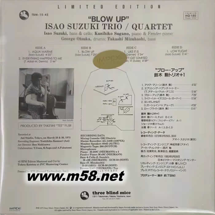 Isao Suzuki Trio Quartet 鈴木勛 - Blow Up (三盲鼠) 180g 45RPM LP 雙黑膠(m58.net) 一張爵士名盤,1973的錄音,精良的制作代表了三盲鼠的最高水平之一,整張專輯都非常流暢,大提琴生深沉感十足,鋼琴方面又十分靈動。有著恰到好處的完美。45轉(zhuǎn)雙黑膠限量版。
