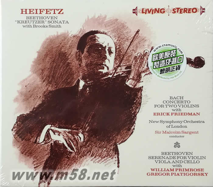 Beethoven: Sonata for Violin & piano No.9 in A Major, Op.47 Jascha Heifetz, Violin / Brooks Smith, Piano Recorded in Los Angeles, Sep 22 & 23, 1960 01. Adagio Sostenuto 02. Adante con Variazione 03. Finale-Presto Bach: Concerto fro Two Violins in D Minor Erick Friedman, violin Recorded in Walthamstown Town Hall, London, May 19 & 20, 1961 04. Vivace 05. Largo ma non tanto 06. Allegro Beethoven: Serenade for Violin, Viola & Cello in D Major, Op.8 Jascha Heifetz, Violin / William Primrose, viola / Gregor Piatigorsky, cello Recorded in Los Angeles, Aug 15-22, 1960 07. Marcia. Allegro 08. Adagio 09. Menuetto, Allegretto 10. Adagio-Scherzo Allegro molto 11. Allegretto alla polacca 12. Andante quasi allegretto 13. Allegro 14. Marcia. Allegro