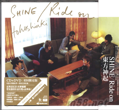 SHINE RIDE ON(CD+DVD臺灣初回限定版)(m58.net) 人氣席捲全亞洲的美聲男孩團體東方神起,最新日文單曲「SHINE/Ride on」,融合J-POP與超酷R&B節奏,帶來濃厚秋意的雙A面單曲?!窼HINE」收錄為TBS日劇30「萬萬歲!(暫譯)」主題曲。韓國電影「颱風太陽」形象歌曲。同時推出CD+DVD以及CD ONLY兩種版本。CD+DVD的DVD收錄「SHINE」的音樂錄影帶。初回限定版加收幕后花絮影像。