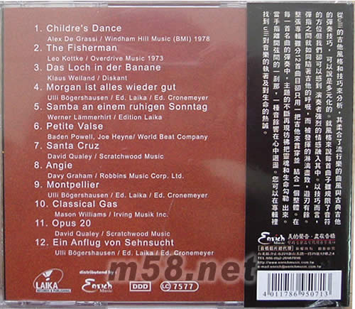 吉他靈魂 尤利。博格斯豪森(m58.net) 從Ulli的吉他風格和技巧來分析,其柔合了流行樂的曲風與古典吉他的彈奏技巧,可以說是多元化的。就風格來說每首曲子雖規限了音符的方位但我們卻可以感到 演奏者強烈的情感融入其中。以技巧而言,彈指之間就如同隨著吉他的呼吸,而被發揮的淋漓盡致,游刃有餘。整張專輯雖分12首曲目卻只用一把吉他來貫穿并結合一個整體。在每一首名曲的彈奏中,主題的不斷再現彷彿把靈魂和生命勾勒出來。當手指離開弦間的一剎那,一種音餘響在心中迴盪。您可以在專輯裡找到Ulli對音樂的執著及對生命的熱誠。