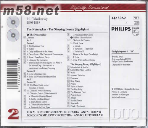 柴可夫斯基 芭蕾舞劇 胡桃夾子 TCHAIKOVSKY THE SLEEPING BEAUTY DECCA版(m58.net) 在柴可夫斯基的三大舞劇音樂中,《胡桃夾子》是被演錄得最多的。它的組曲開式也經常會在柴氏的唱片里出現,這一切,都得益于《胡桃夾子》的音樂機智、美妙、童趣十足,以及它的配器生動,樂隊色彩晶蒙而飄逸。而《睡美人》則將傳統的古典舞劇引向了高峰,在杜拉第精湛的指揮下,本錄音征服了樂迷