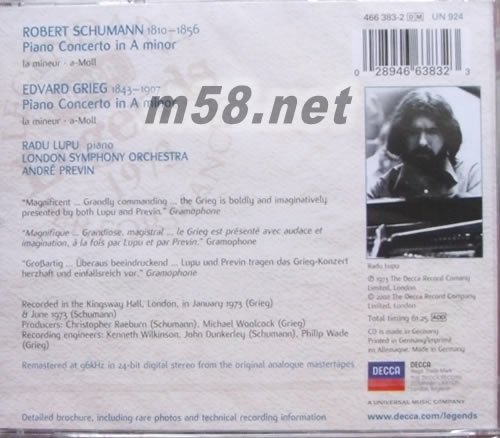 葛利格&舒曼:小調(diào)鋼琴協(xié)奏曲 Grieg/Schumann:Piano Concertos(m58.net) 羅馬尼亞鋼琴家魯普與名指揮普烈文的這套舒曼與葛利格鋼琴協(xié)奏曲唱片,為DECCA歷來最好的鋼琴錄音之一。錄音地點英國Kingsway廳本就具有優(yōu)異的音響條件,通透的琴韻與飽滿的管弦樂,加上良好的平衡感,構(gòu)成寬松且不局促、不空蕩的聆樂感,早年即已高掛美國TAS發(fā)燒榜單。魯普具備了一般鋼琴家中少見的大膽創(chuàng)意與細(xì)膩詩情,其慧眼常能窺見樂曲的深邃內(nèi)涵,舒曼與葛利格的兩首a小調(diào)協(xié)奏曲特有的浪漫性格恒能與魯普的演奏特色相吻合,復(fù)又獲得普烈文與倫敦交響樂團以堅實的管弦音色支撐,使本輯錄音突出,演奏亦時能令人喜出望外
