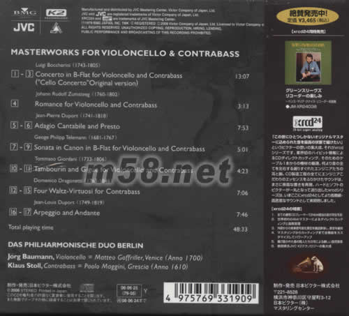 LUIGI BOCCHERINI (1743-1805) 1-3.CONCERTO IN B-FLAT FOR VIOLONCELLO AND CONTRABASS (CELLO CONCERTO ORIGINAL VERSION) JOHANN RUDOLF ZUMSTEEG (1760-1802) 4.ROMANCE FOR VIOLONCELLO AND CONTRABASS JEAN-PIERRE DUPORT(1741-1818) 5-6.ADAGIO CANTABILE AND PRESTO GEOGE PHILIPP TELEMANN(1681-1767) 7-9.SONATA IN CAON IN B-FLAT FOR VIOLONCELLO AND CONTRADASS TOMMASO GIORDANI (1733-1806) 10-11.TAMBOURIN AND GIGUE FOR VIOLONCELLO AND CONTRABASS DOMENICO DRAGONETTI(1763-1846) 12-15.FOUR WALTZ-VIRTUOSI FOR CONTRABASS JEAN-LOUIS DUPORT(1749-1819) 16-17.ARPEGGIO AND ANDANTE