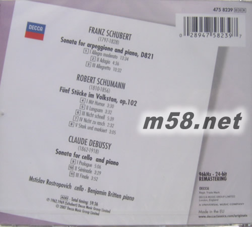 SCHUMANN 大提琴奏鳴曲 舒曼大提琴DEBUSSY(m58.net) 這是Decca Legends 傳奇唱片系列最具經典色彩、最超值的唱片之一,羅斯特羅波維奇絕對是詮釋舒伯特 的不二權威,這個“傳奇”專輯中的舒伯特阿佩喬尼奏鳴曲被譽為此曲的最佳版本。舒伯特這首獨特作品 原是為六根弦的阿佩喬尼琴所作,羅斯特羅波維奇改以四根弦的大提琴演奏,技巧卻絲毫不見滯澀,可見 其功力之深。布里頓雖以作曲家名世,但其鋼琴演奏同樣出色,體現了互為襯托的效果。此外,這張唱片 還收錄了舒曼五首民謠 Op. 102、德彪西D小調大提琴奏鳴曲,兩位大師的配合天衣無縫,相得益彰,成 就了這張彌足珍貴的天碟。