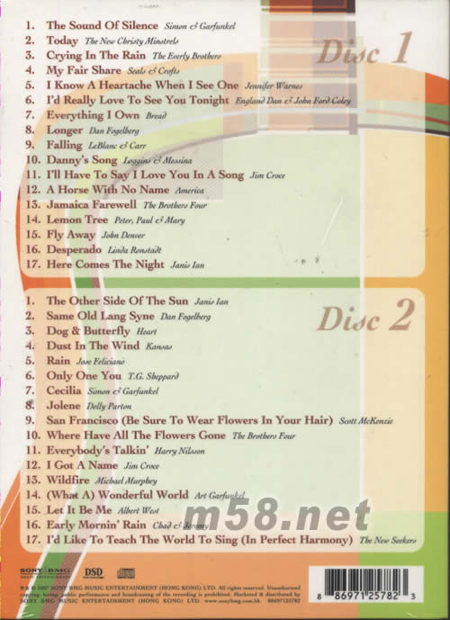 GOOD FOLK DAYS(民謠的好時光)(m58.net) 回憶總是甜蜜的,就讓時光倒流數十年,重回民歌的光輝歲月,讓我們重拾往昔的浪漫。Good Folk Days雙CD集收錄了34首經典民歌,讓歌迷一次過重溫最好時光。包括Simon & Garfunkel/The Sound Of Silence、Janis Ian/The Other Side Of The Sun、The Everly Brothers/Crying In the Rain、Dan Fogelberg/Same Old Lang Syne等等。