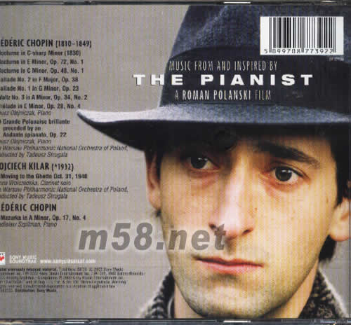 鋼琴家THE PIANIST(m58.net) 本片由「黛絲姑娘」、「驚狂記」、「鬼上門」等片揚名國際影壇的法國名導(dǎo)羅曼波蘭斯基執(zhí)導(dǎo),「化妝師」金獎提名編劇家Ronald Harwood改編。音樂配樂是由「吸血鬼」、「伴我一世情」(The Portrait Of A Lady)之波蘭音樂家Wojciech Kilar為電影所作的原著音樂,同時還選錄70年代於華沙國際蕭邦鋼琴大賽贏得大獎的波蘭鋼琴家Janusz Olejniczak演繹八段蕭邦的樂章,更不能不提的是,在專輯中彌足珍貴的收錄了故事中主角Szpilman本人在1948年於波蘭親自演奏蕭邦的馬厝卡舞曲 (Mazurka)第17號第4段樂曲的歷史錄音。