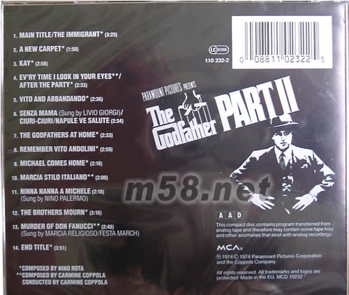 1. Main Title/The Immigrant 2. New Carpet 3. Kay - Beres Hammond 4. Ev'ry Time I Look in Your Eyes/After the Party 5. Vito and Abbandando 6. Senza Mamma/Diuri-Ciuri/Napule Ve Salute 7. Godfathers at Home - Beres Hammond 8. Remember Vito Andolini 9. Michael Comes Home 10. Marcia Stilo Italiano - Carmine Coppola 11. Ninna Nanna a Michele 12. Brothers Mourn 13. Murder of Dom Fanucci - Carmine Coppola 14. End Title