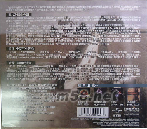 1.Hymn To The Fallen 6:10 陣亡戰士禮贊 2.Revisting Nonmandy 4:06 重返諾曼地 3.Omaha Beach 9:15 奧瑪哈海灘 4.Finding Private Ryan 4:37 搜尋雷恩大兵 5.Approaching The Enemy 4:31 逼近敵人陣營 6.Defense Preparations 5:54 防御工事 7.Wade's Death 4:30 韋德陣亡 8.High School Teacher 11:03 高中老師 9.The Last Battle 7:57 最后決戰 10.Hymn To The Fallen 陣亡戰士禮贊