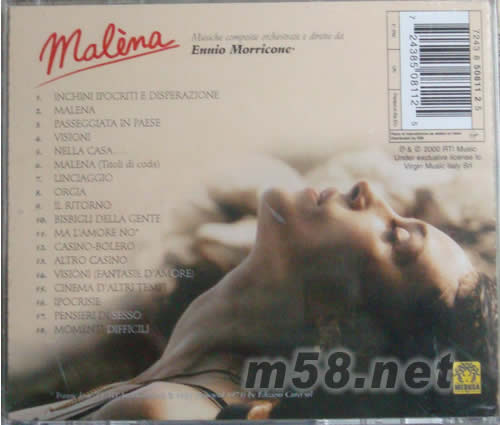01.Inchini Ipocriti e Disperazione [2:04] 02. Malena [2:37] 03. Passeggiata in Paese [3:17] 04. Visioni [2:36] 05. Nella Casa..... [2:16] 06. Malena (End Titles) [4:25] 07. Linciaggio [2:46] 08. Orgia [1:13] 09. Il Ritorno [1:47] 10. Bisbigli Della Gente [2:42] 11. Ma l’Amore No [1:52] 12. Casino-Bolero [2:10] 13. Altro Casino [2:17] 14. Visioni (Fantasie d’Amore) [2:15] 15. Cinema d’Altri Tempi [3:40] 16. Ipocrisie [2:01] 17. Pensieri di Sesso [2:29] 18. Momenti Difficili [4:19]