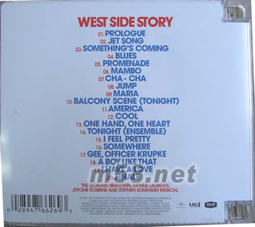 01. PROLOGUE 02. JET SONG 03. SOMETHING'S COMING 04. BLUES 05. PROMENADE 06. MAMBO 07. CHA-CHA 08. JUMP 09. MARIA 10. BALCONY SCENE(TONIGHT) 11. AMERICA 12. COOL 13. ONE HAND ONE HEART 14. TONIGHT(ENSEMBLE) 15. I FEEL PRETTY 16. SOMEWHERE 17. GEE,OFFICER KRUPKE 18. A BOY LIKE THAT 19. I HAVE A LOVE 20. FINALE