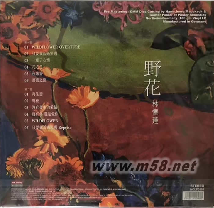 野花 180g 33RPM LP黑膠 絕對限量珍藏版(m58.net) 野花 是一張非常完整的概念化專輯,整張專輯以花的靈魂和懷舊為主題, 主打歌《再生戀》將上海越劇元素與Hip Hop節奏揉合,大膽創新,所有歌以花喻人,散發中國現代女性的婉約、敏感與堅強,受到樂評人贊賞,并引起日本市場關注。林憶蓮在都市觸覺中被忽略的溫柔、感性和非主流的一面在這專輯中充分展現。
