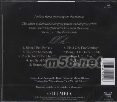 1.SINCE I FELL FOR YOU 2.TO LOVE SOMEBODY 3.REACH OUT I'LL BE THERE 4.YOU SEND ME 5.YESTERDAY 6.HOLD ON,I'M COMING 7.BRING IT ON HOME TO ME 8.KNOCK O WOOD 9.REIFT AWAY 10.WHITE CHRISTMAS