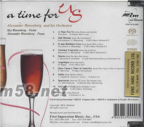 01 A Time For US 02 Old Melody 03 O mio Babbino Caro 04 Clarinet Concerto 05 Maria 06 Angelique 07 Once Upon a Time in America 08 Smile 09 Spartacus 10 Schindler's List 11 Adagio