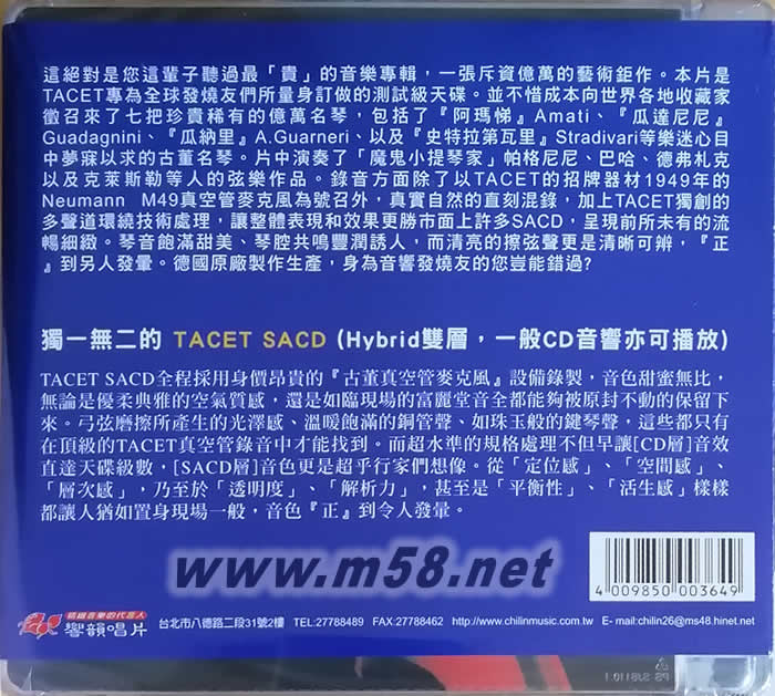 七把名琴WHAT ABOUT THIS Mr. PAGANINI ?你看到什么?帕格尼尼先生SACD(m58.net) 帕格尼尼不但是曠世無雙的小提琴奇才,他還收藏了廿多把義大利克里蒙納的名琴,其中最深愛的瓜納里名琴被暱稱為「加農砲」,成為一段傳奇。如果帕格尼尼有知,看到本片從世界各地所蒐集到七把珍貴小提琴,只怕會從地底跳了出來。這些小提琴包括一把阿瑪悌、一把瓜達尼尼、兩把瓜納里、一把史特拉第瓦里以及其他現代名師的製作。在德國科隆的交響樂廳中,利用這些名琴演奏了巴哈、帕格尼泥、德佛札克、克萊斯勒、魏本等人的弦樂作品。錄音當然還是以 1949 年的 Neumann M49 真空管麥克風進行,那價值連城的演出,你看到了嗎?