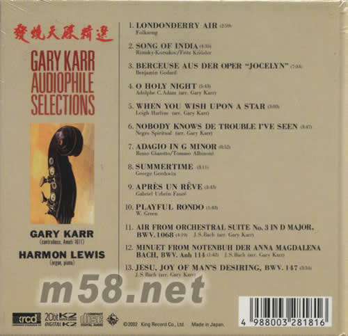 價(jià)格為估,以實(shí)到貨為準(zhǔn)! AUDIOPHILE SELECTIONS發(fā)燒天碟精選(大提琴XRCD)(m58.net) [低音大提琴發(fā)燒天碟精選XRCD版] ‘GARY KARR’被譽(yù)為當(dāng)今最出色的低音大提琴演奏家,多年來他以歷史上最靚聲的低音大提琴AMATI1611演奏出一些最動(dòng)聽的古典小品及通俗曲目,由于錄音邀請日本發(fā)燒錄音師‘高浪初郎’以德律風(fēng)根真空管拾音器灌錄,使琴聲更美艷。