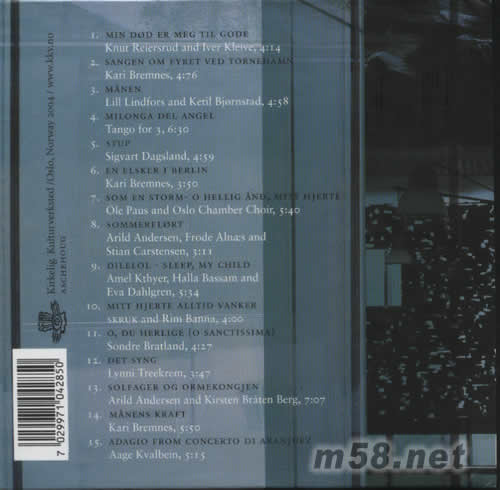 1. MIN DOD ER MEG TIL GODE / KNUT REIERSRUD & IVER KLEIVE 2. SANGEN OM FYRET VED TORNEHAMN / KARI BREMNES 3. MANEN / LILL LINDFORS 4. MILONGA DEL ANGEL / TANGO FOR 3 5. STUP / SIGVART DAGSLAND 6. EN ELSKER I BERLIN / KARI BREMNES 7. SOM EN STORM - O HELLIG AND, MITT HJERTE / PAUS OLE & OSLO CHAMBER CHOIR 8. SOMMERFLORT / ANDERSEN, ALNAS & CARSTENSEN 9. DILELOL/ SLEEP, MY CHILD / AMEL KTHYER, HALLA BASSAM , EVA DAHLGREN 10. MITT HJERTE ALLTID VANKER / SKRUK & RIM BANNA 11. O, DU HELLIGE (O SANCTISSIMA) / SONDRE BRATLAND 12. DET SYNG - LYNNI TREEKREM 13. DET SYNG - LYNNI TREEKREM 14. MANENS KRAFT / KARI BREMNES 15. ADAGIO FROM CONCERTO DI ARANJUEZ / AAGE KVALBEIN