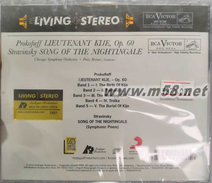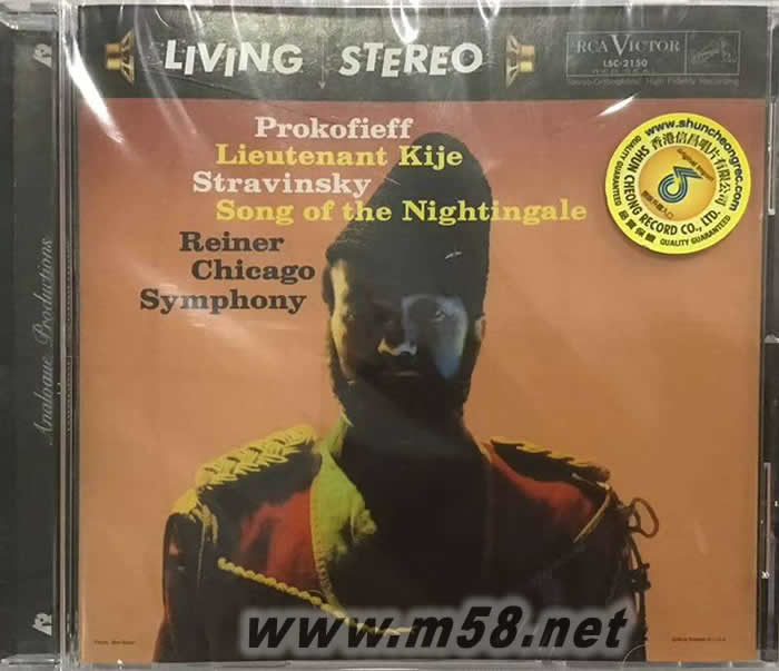 PROKOFIEFF: LIEUTENANT KIJE 普羅科菲夫:基日中尉 斯特拉文斯基:夜鶯之歌 SONG OF THE NIGHTINGALE 立體聲CD(m58.net) Prokofieff: Lieutenant Kije (基日中尉) TAS 40週年選出40張永遠最重要上榜天碟之一,地位非凡,靚聲爆燈之選。除了普羅高菲夫「基日中尉」及史特拉汶斯基「夜鶯之歌」外,更額外附上由萊納指揮芝加哥交響樂團演出之施特勞斯「查拉圖斯如是說」,2 Original LPs on 1 CD、Original Cover Art and Liner Notes、Newly Remastered in 24-Bit,兩張作品,單碟推出。