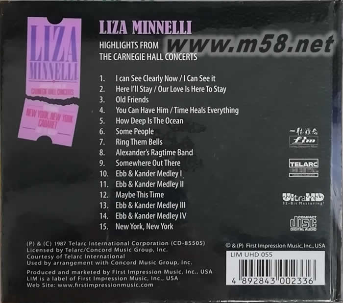 NIGHLIGHTS FROM THE CARNEGIE HALL OCNCERTS UltraHD(m58.net) 麗莎·明尼里的父親是上世紀中期好萊塢黑白舞臺劇片時代著名的導(dǎo)演文森特·明尼里,母親是著名女星朱迪·加蘭。上世紀70年代,麗莎成為當(dāng)紅演員、歌手、舞蹈演員和電視節(jié)目主持人。她的主要影視作品有《何日卿再來》、《紐約,紐約》和《日落西沉之華爾茲》等。1973年她憑借影片《歌廳》獲得奧斯卡最佳女主角獎。