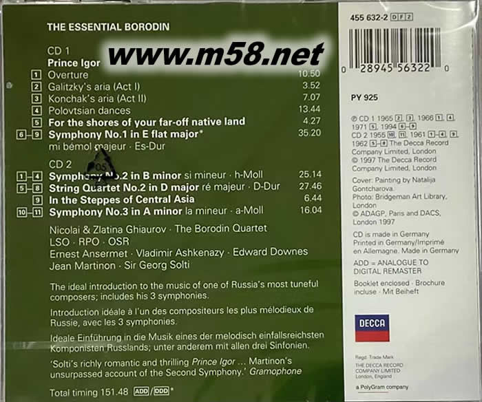 CD 1: The Essential Borodin Alexander Borodin (1833 - 1887) 1. Overture Prince Igor, Orch. and completed Alexander Glazunov (1865-1936) 10:50 London Symphony Orchestra, Georg Solti Prince Igor, Arranged by N. Rimsky-Korsakov (1844-1908) - Act 1 2. "Greshno tait, ya skuki ne lyublyu (Galitzky`s Aria) 3:52 Nicolai Ghiaurov, London Symphony Chorus, London Symphony Orchestra, Edward Downes Act 2 3. Zdorov-li, Knaz? (Konchak`s Aria) 7:07 Nicolai Ghiaurov, London Symphony Orchestra, Edward Downes Act 2 4. Polovtsian Dances and Chorus 13:44 London Symphony Chorus, London Symphony Orchestra, Georg Solti 5. Dlya Beregov Otschizni Dal`noi (For the Shores of Your Distant Homeland) 4:27 Nicolai Ghiaurov, Zlatina Ghiaurov Symphony No.1 in E flat 6. 1. Adagio - Allegro 13:01 7. 2. Scherzo (Prestissimo) - Trio (Allegro) 6:56 8. 3. Andante 8:00 9. 4. Allegro molto vivace 7:12 Royal Philharmonic Orchestra, Vladimir Ashkenazy Total Playing Time: 1:15:09 CD 2: The Essential Borodin Alexander Borodin (1833 - 1887) Symphony No.2 in B minor, revised Rimsky-Korsakov & Glazunov 1. 1. Allegro 6:44 2. 2. Scherzo: Prestissimo - Allegretto 4:38 3. 3. Andante 7:44 4. 4. Finale: Allegro 5:58 London Symphony Orchestra, Jean Martinon String Quartet No.2 in D 5. 1. Allegro 7:51 6. 2. Scherzo 4:45 7. 3. Notturno 8:09 8. 4. Finale 6:51 Borodin Quartet 9. In the Steppes of Central Asia 6:44 L`Orchestre de la Suisse Romande, Ernest Ansermet Symphony No.3 in A minor (Unfinished), Completed & Orchestrated by Alexander Glazunov 10. 1. Moderato assai 7:15 11. 2. Scherzo (Vivo - moderato) 8:45 L`Orchestre de la Suisse Romande, Ernest Ansermet Total Playing Time: 1:15:24