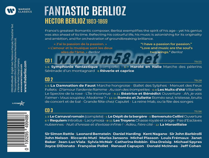 法國偉大作曲家HECTOR BERLIOZ(白遼士)逝世150周年紀(jì)念鑒聽3CD選輯(m58.net) 法國作曲家白遼士,1803年出生於里昂附近的圣昂德雷角,1869年3月8日在巴黎去世。也就是說,到了2019年,白遼士逝世正好屆滿150週年。白遼士作品的藝術(shù)價值,一直要到死后多年的二戰(zhàn)結(jié)束之后,才逐漸為世人所熟知。白遼士的孩提時代,並沒有受過太多的音樂教育,鋼琴也彈得不好,然而,白遼士的音樂生涯,堪稱浪漫樂派作曲家的縮影。他所彰顯的是19世紀(jì)主宰整個藝術(shù)世界的浪漫精神:強調(diào)個人的靈感與主觀性,優(yōu)先於一切。他是貝多芬─浪漫樂派之父的狂熱崇拜者,也從莎士比亞、歌德、拜倫、雨果等人的文學(xué)作品當(dāng)中,汲取創(chuàng)作養(yǎng)份。白遼士擅長用音樂表現(xiàn)他多采多姿的生活,他的情感強烈,以致於他無法安於規(guī)律的生活,他為了藝術(shù)與創(chuàng)作,燃燒生命。他的大部分作品都帶有自傳性質(zhì)。最著名的作品《幻想交響曲》(1830年)的靈感來自於他對英國女演員哈麗特‧史密森(Harriet Smithson)的癡迷,最終修成正果。從他的作品可以感受到極富個人色彩的創(chuàng)作野心與原創(chuàng)性,比方說,他在《亡靈大彌撒》(安魂曲)當(dāng)中就使用了16支定音鼓,在歌劇《特洛伊人》里用了六把豎琴。獨特的詩意與個人色彩濃烈的氛圍,是他重要作品當(dāng)中最顯著的特色,特別是在史詩歌劇《特洛伊人》中,最能夠總結(jié)白遼士的音樂藝術(shù)的多樣性。
