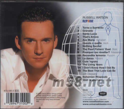 REPRISE(m58.net) Russell Watson英國歷史上最暢銷的古典跨界通俗的歌唱家。Russell Watson也因此連續兩年奪得英國古典音樂專輯大獎(Classical Brits )及最佳男藝人獎。獲得樂迷的廣泛好評。他擅長把古典歌劇聲樂選段和優美抒情的流行旋律相結合.DECCA公司的錄音水準一如既往的清晰明快,充分表現出Russell Watson那無比動人的嗓音。