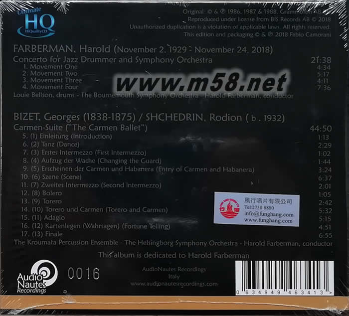 卡門組曲 Concerto to Jazz Drummer / Carmen Suite UHQCD 頭版(m58.net) 法伯曼協(xié)奏曲爵士鼓手&謝德林 敲擊卡門 ( 瑞典BIS 精心錄音/意大利AudioNautes出品 Harold Farberman 指揮/Kroumata打擊樂團(tuán) * 比才“卡門組曲”敲擊樂版本 錄音效果及悅耳的旋律 音響發(fā)燒友試音碟 由前蘇聯(lián)作曲家·謝德林改編的《卡門組曲》,是作為一出獨幕舞劇的配樂而作的。打擊樂在這專輯占了主導(dǎo)地位,與原曲的先后順序,作了重新編排,結(jié)果是讓我們聽到了一個令人頗覺新鮮有趣的,而效果格外迷人的『卡門』。喜歡打擊樂的“發(fā)燒友”,一定會聽得不亦樂乎。這首曲寫于1967年,算得上是演奏得最多的當(dāng)代曲目之一。首批限量珍藏版、附獨立編號。