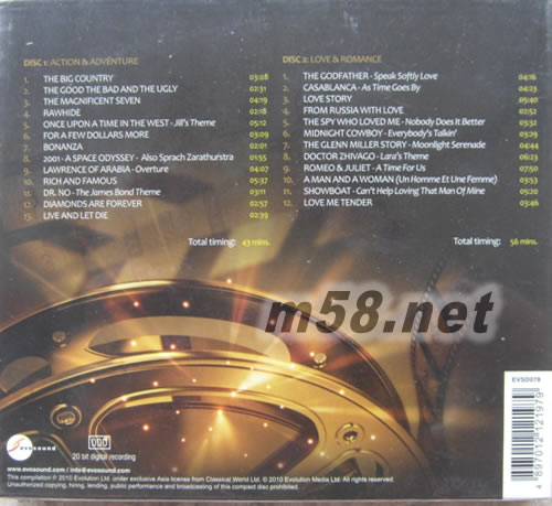 DISK 1 CD 1. THE BIG COUNTRY 2. THE GOOD THE BAD AND THE UGLY 3. THE MAGNIFICENT SEVEN 4. RAWHIDE 5. ONCE UPON A TIME IN THE WEST - Jill’s Theme 6. FOR A FEW DOLLARS MORE 7. BONANZA 8. 2001 - A SPACE ODYSSEY - Also Sprach Zarathurstra 9. LAWRENCE OF ARABIA - Overture 10. RICH AND FAMOUS 11. DR. NO - The James Bond Theme 12. DIAMONDS ARE FOREVER 13. LIVE AND LET DIE