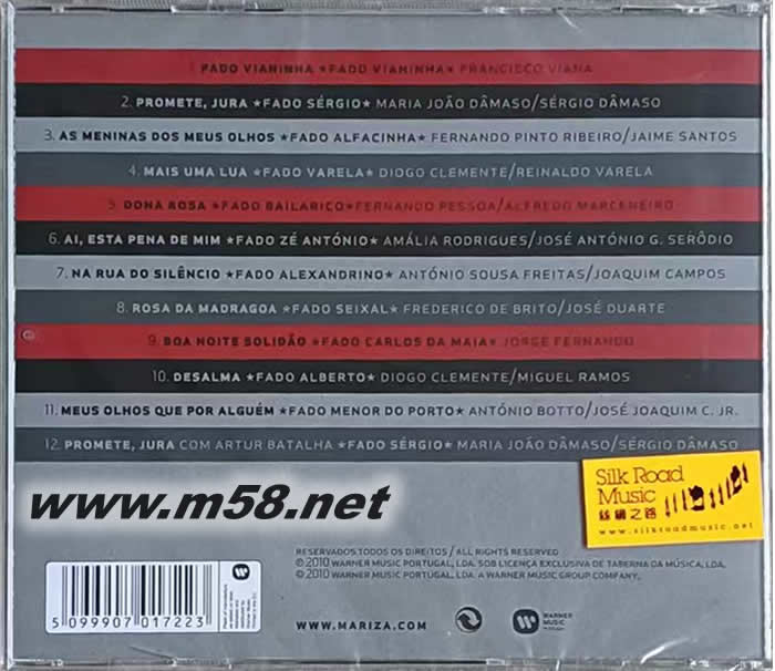 1.MarizaFado Vianinha 02:31 2.MarizaPromete, Jura 03:53 3.MarizaAs Meninas Dos Meus Olhos 02:34 4.MarizaMais Uma Lua 03:37 5.MarizaDona Rosa02:15 6.MarizaAi, Esta Pena De Mim 02:33 7.MarizaNa Rua Do Silêncio 02:48 8.MarizaRosa Da Madragoa 01:54 9.MarizaBoa Noite Solidão 03:45 10.MarizaDesalma 02:30 11.MarizaMeus Olhos Que Por Alguém 02:53 12.Mariza Com Artur BatalhaPromete, Jura 03:53