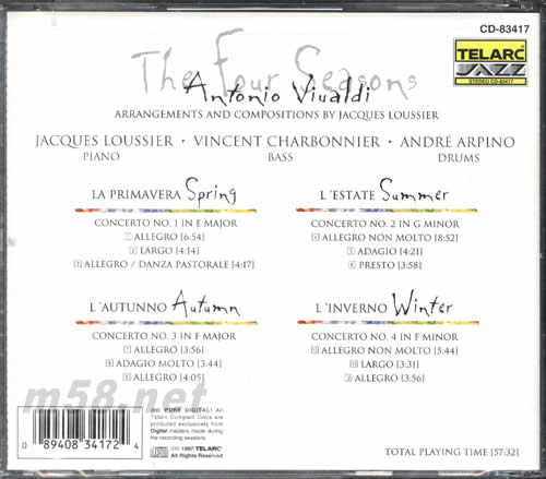 THE FOUR SEASONS爵士四季(m58.net) 從20世紀60年代至今,JACOUES LOUSSIER與另兩位樂手搭擋、以爵士三重奏的形式盡情揮灑,他們演奏的“爵士巴赫”、以及其它“爵士古典”遠近流播,傳遍世界各地。其先后錄制的一些唱片也暢銷不衰,廣得青睞。 JACOUES LOUSSIER在1934年出生于法國,他對爵士和古典雙重的愛讓他成了獨具個性和創意的鋼琴家,他獨樹一幟,哪管改編《四季》等古典名曲不是容易事,聽眾所熟知的古典春夏秋冬,四段十二個樂章,改成爵士味那得是啥感覺?仔細聽過唱片后,會發現LOUSIER在維瓦爾第的古典與爵士樂間的平衡處理造詣非凡,三百多年的時空間隔并沒有成為兩者在音樂上交流互動的障礙。 他保持關古典出身的嚴謹和穩定,同時幻化即興跳躍的閃爍思維。貝司手鼓手配合得不錯,不論模仿自然的雷聲或者和風細雨都是高手。 本專輯《爵士四季》在LOUSIER的私家錄音室完成,這個錄音室位于法國南部的農莊中,這個葡萄園農莊已有數百年歷史。而專輯使用的錄音設備是是SONY48軌數碼產品。